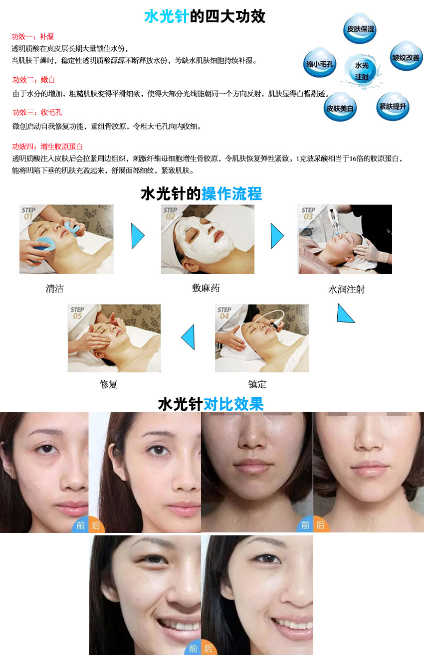 A:水光注射就是利用透明質(zhì)酸直接對(duì)皮膚進(jìn)行注射,能夠讓面部皮膚水潤(rùn)柔嫩、光澤透亮,讓您擁有藝人般光滑透亮的皮膚,能夠解決真皮層缺少水分的問(wèn)題,改善細(xì)小皺紋,帶來(lái)明顯效果。1次水光注射相當(dāng)于1000次日常護(hù)理,5000次面膜護(hù)理。
