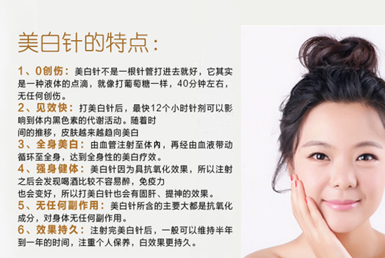 美白針是通過(guò)注射的方式來(lái)解決面部問(wèn)題快速分解人體肌膚的黑色素、黃色素,修復(fù)受損細(xì)胞,補(bǔ)充活化美白因子使全身美白因子的細(xì)胞更新,令全身肌膚由內(nèi)至外白里透紅、恢復(fù)彈性,其特點(diǎn)在于能迅速扭轉(zhuǎn)病態(tài)功能細(xì)胞的早衰老化,抑制細(xì)胞氧化,阻止黑色素生成,促進(jìn)新陳代謝,有效減弱和祛除色斑,由內(nèi)而外調(diào)節(jié)肌膚,達(dá)到全身美白效果